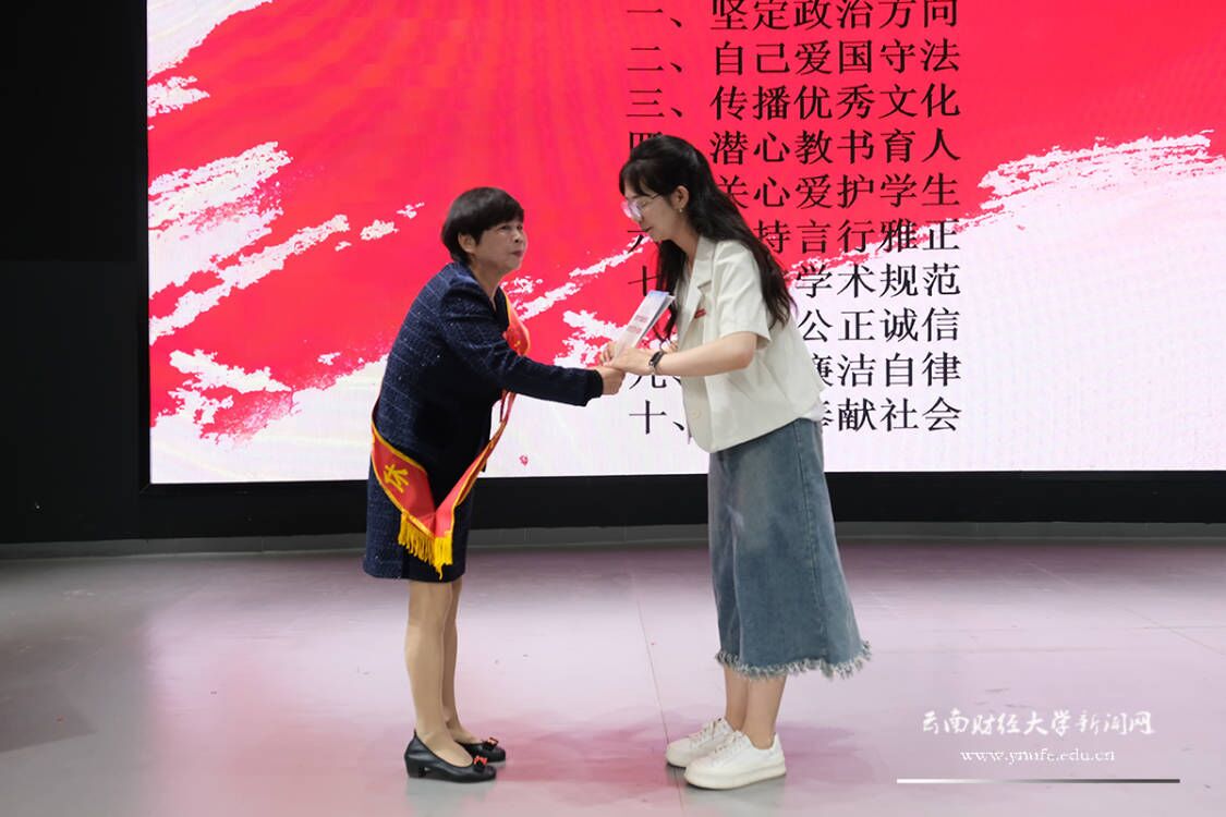 在新老教师交接仪式上,冯忠明老师郑重地为新教师王佳琳佩戴校徽,庄重地把《新时代高校教师职业行为十项准则》转交给王佳琳老师。新退休教职工所在单位(部门)代表敬献了花束,云财学生合唱团献唱了歌曲《誓言》。