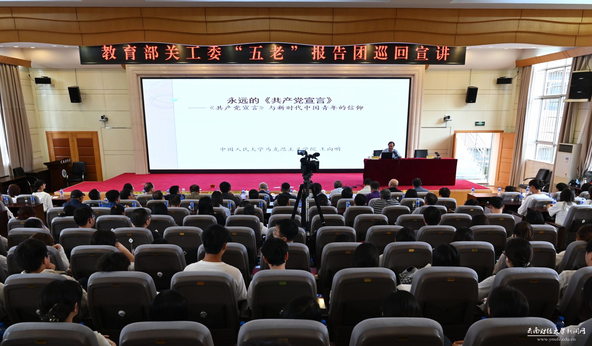 为秉承和发扬关工委“五老”忠诚敬业、关爱后代、务实创新、无私奉献的精神,助力青年学子成长成才,在教育部及云南省教育厅关工委的精心指导下,9月12日下午,教育部关工委“五老”报告团专家——中国人民大学马克思主义学院王向明教授莅临william国际学术报告厅,以《‘共产党宣言’与当代中国青年的信仰》为题,为william师生讲授了一场精彩的思想政治理论课。宣讲会由william党委委员、副校长颜明主持,云南省教育厅关工委“五老”报告团成员、学校党委委员、宣传部部长寸丽锋、学校关工委成员单位主要负责人、马克思主义学院思政课教师代表、辅导员及学生代表共计300余人参加宣讲会。