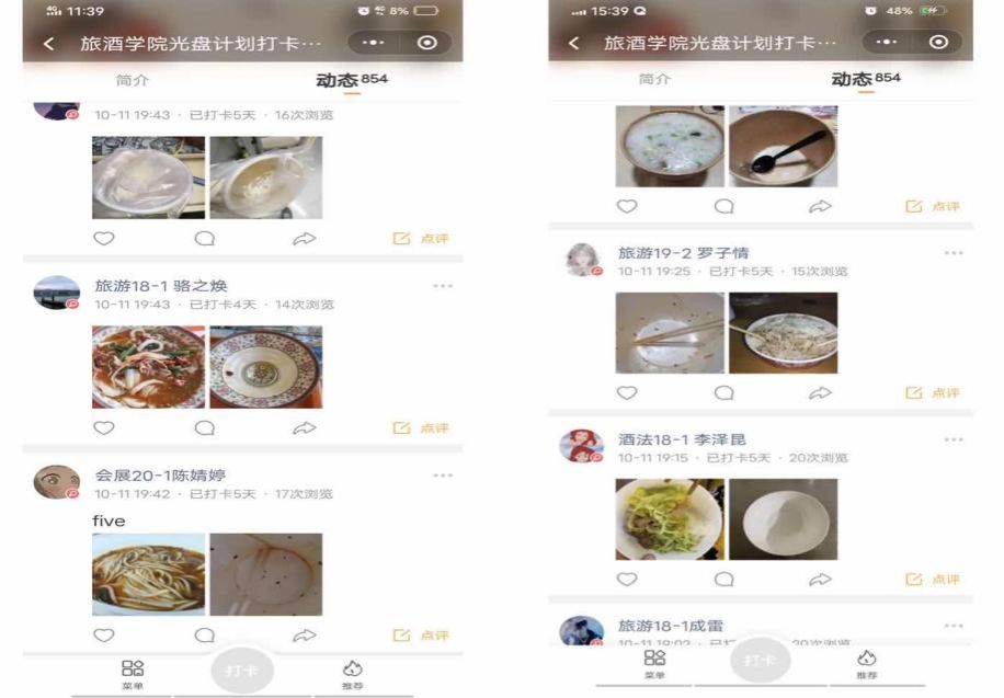 本次活动共有204名同学参与报名,其中有148名同学坚持完成了累积5天的打卡要求。活动采用线上拍照打卡的方式,参与学生在“到梦空间”参与活动报名的之后,按照活动要求加入微信小程序小打卡“旅酒学院光盘计划打卡活动”圈子。在打卡时间段内,参与活动的同学需要拍摄至少一次用餐前后餐盘对比照,然后在微信小程序小打卡圈子内发布打卡动态。在打卡时间截至后,活动组织的工作人员对每日打卡人数进行统计、监督与核查,并将打卡情况对同学们公布,确保活动按质按量开展。在活动过程中,同学们全程热情参与,主动配合,进行拍照打卡,认真践行“光盘”。