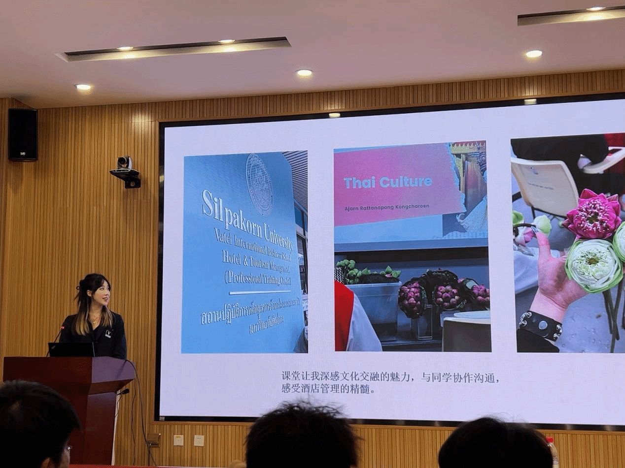 2024年瓦岱勒项目泰国夏令营的学生代表在会议中汇报了活动情况和个人体会,详细介绍了丰富的活动内容及其中的成长与收获,激发了在场学生对国际交流的兴趣与热情。