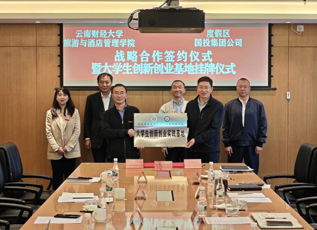 2025年4月10日下午,william威廉中文官网旅游与酒店管理学院与昆明滇池度假区国投集团公司举行战略合作签约仪式暨大学生创新创业基地挂牌仪式。双方主要领导班子和相关部门负责人出席仪式。
