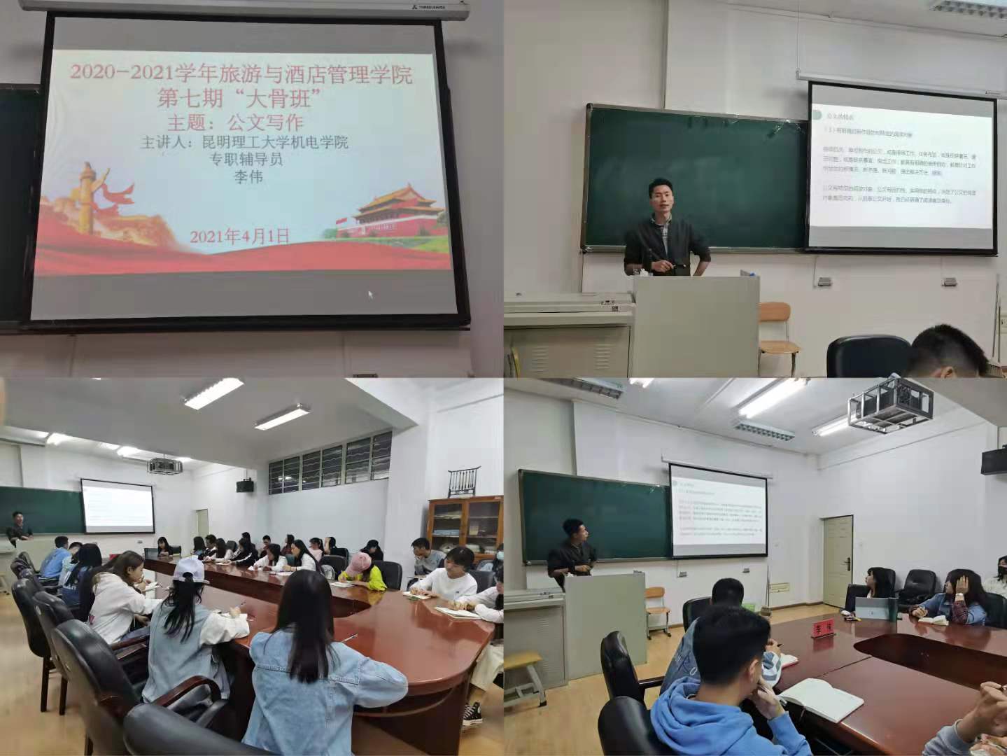为进一步推动旅酒精英训练营计划,巩固"青马"工程实践成果,2021年4月1日19:00—21:00,旅游与酒店管理学院团委在卓远楼213会议室开展第七期“大骨班”培训。此次培训主题为公文写作,由昆明理工大学机电学院专职辅导员李伟老师担任主讲,学院全体学生骨干参加学习。