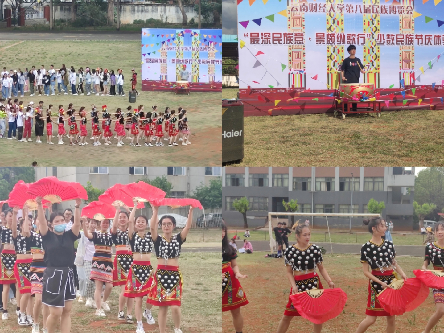 在他们精彩舞姿的吸引下,越来越多的观众加入到目瑙纵歌的队伍。同学们时而手拉手围成一个圆圈,共同摆动身体,时而向前汇聚,将手举向天空,时而将手轻搭在前面同学的肩膀上,一同绕着草坪转圈。在鼓手强烈而有节奏的敲击下,全场的氛围也到达了高潮,本次少数民族节庆体验活动圆满的落下了帷幕。