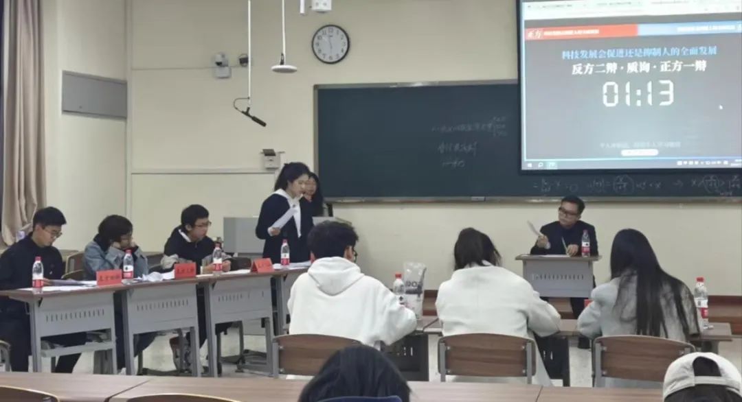 在季军争夺赛中,正反双方就“科技发展会促进还是抑制人的全面发展”展开了激烈交锋。正方旅游24-4班认为科技发展为人们提供了更多学习的机会,极大地促进了社会发展。反方文化24-1班则指出,科技发展带来的信息过载、人际关系疏离等问题,对人的全面发展产生了抑制作用。双方辩手旁征博引、逻辑严密,经过多轮激烈辩论,最终反方凭借出色的团队协作和犀利的言辞表达赢得比赛,获得季军。