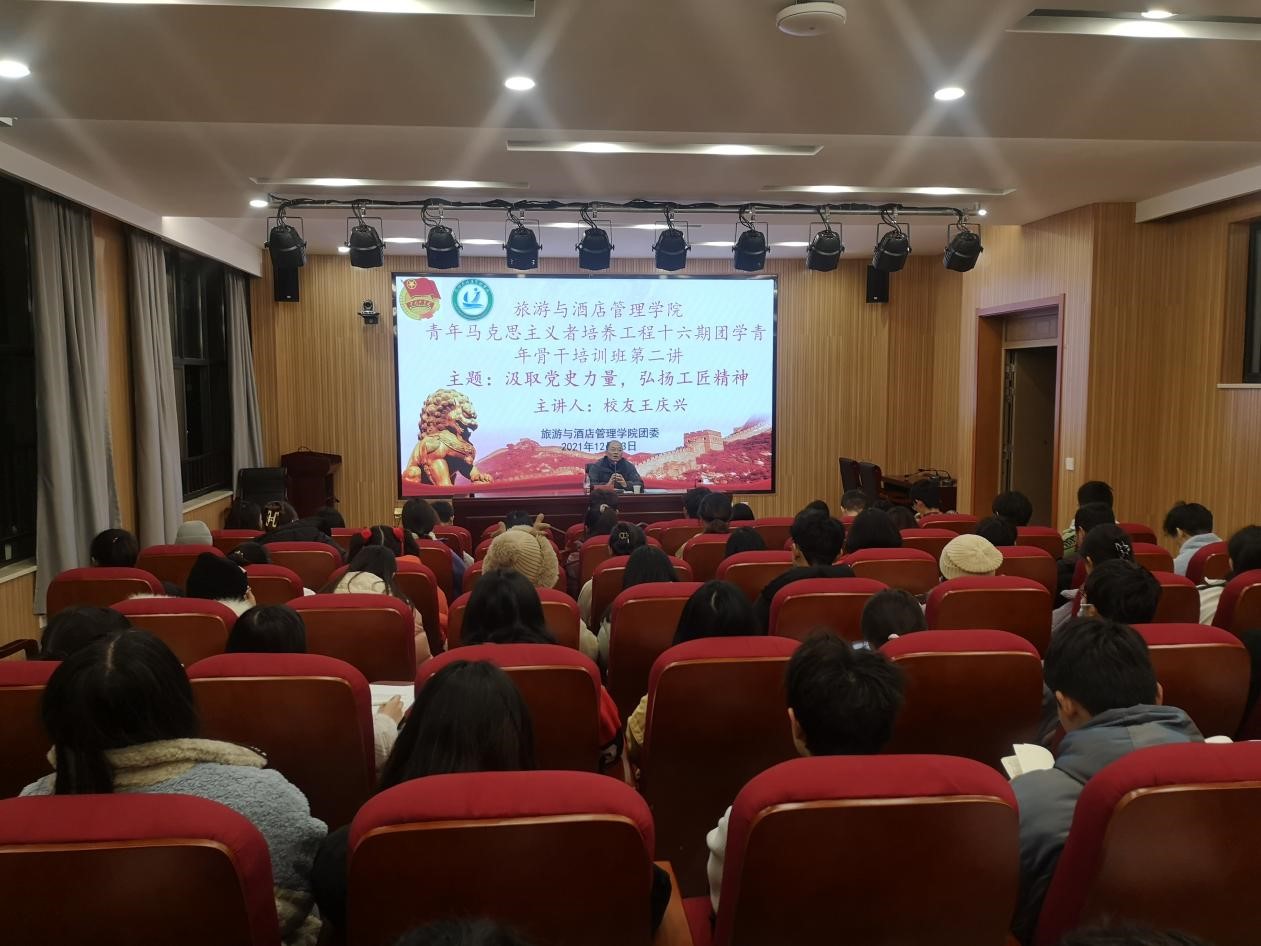 为了教育引导广大青年学生“学党史、感党恩、跟党走”,提升青年学生骨干的理论修养和服务能力,2021年12月23日,旅游与酒店管理学院团委在220报告厅举办第十六期青年马克思主义者培养工程第二讲。邀请学院校友昆明市官渡区政协委员王庆兴作“汲取党史力量 弘扬工匠精神”的专题讲座。70多名学生骨干参加了活动。