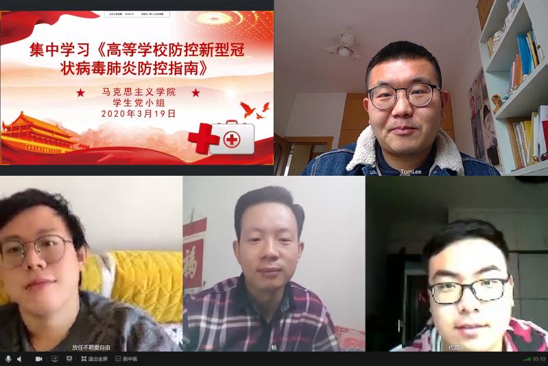 会议由代庭冲主持,学习了习近平总书记关于疫情防控系列讲话精神,就《高等学校防控新型冠状病毒肺炎防控指南》返校前的准备工作部分进行了详细介绍,随后参会人员就疫情期间在家的学习、生活进行了交流。