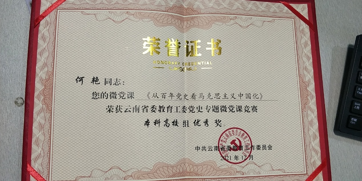 何艳老师在云南省委教育工委党史专题微党课竞赛中获得优秀奖