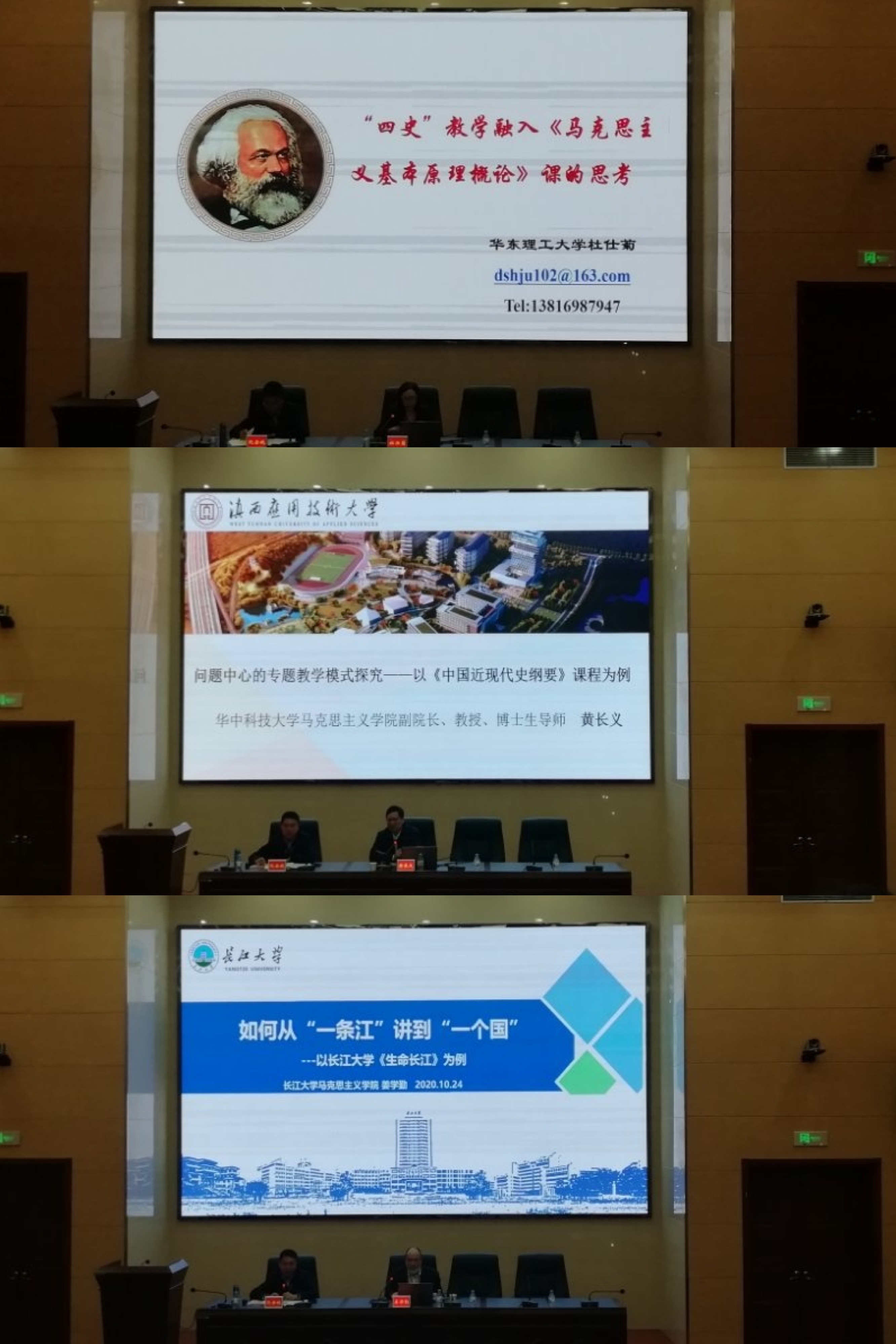 在主题报告环节,教育部高校思想政治理论课教学指导委员会“马克思主义基本原理概论”分教指委委员、华东理工大学马克思主义学院院长杜仕菊教授作《“四史”学习融入课教学的思考》的报告;华中科技大学马克思主义学院副院长黄长义教授作《问题中心的专题教学模式探究——以课程为例》的报告;长江大学马克思主义学院院长姜学勤教授作《如何从一条江讲到一个国:思政选修课建设体会》的报告;广西民族大学马克思主义学院院长李玉雄教授作《关于高校思政课程与课程思政融通机制的思考》的报告。