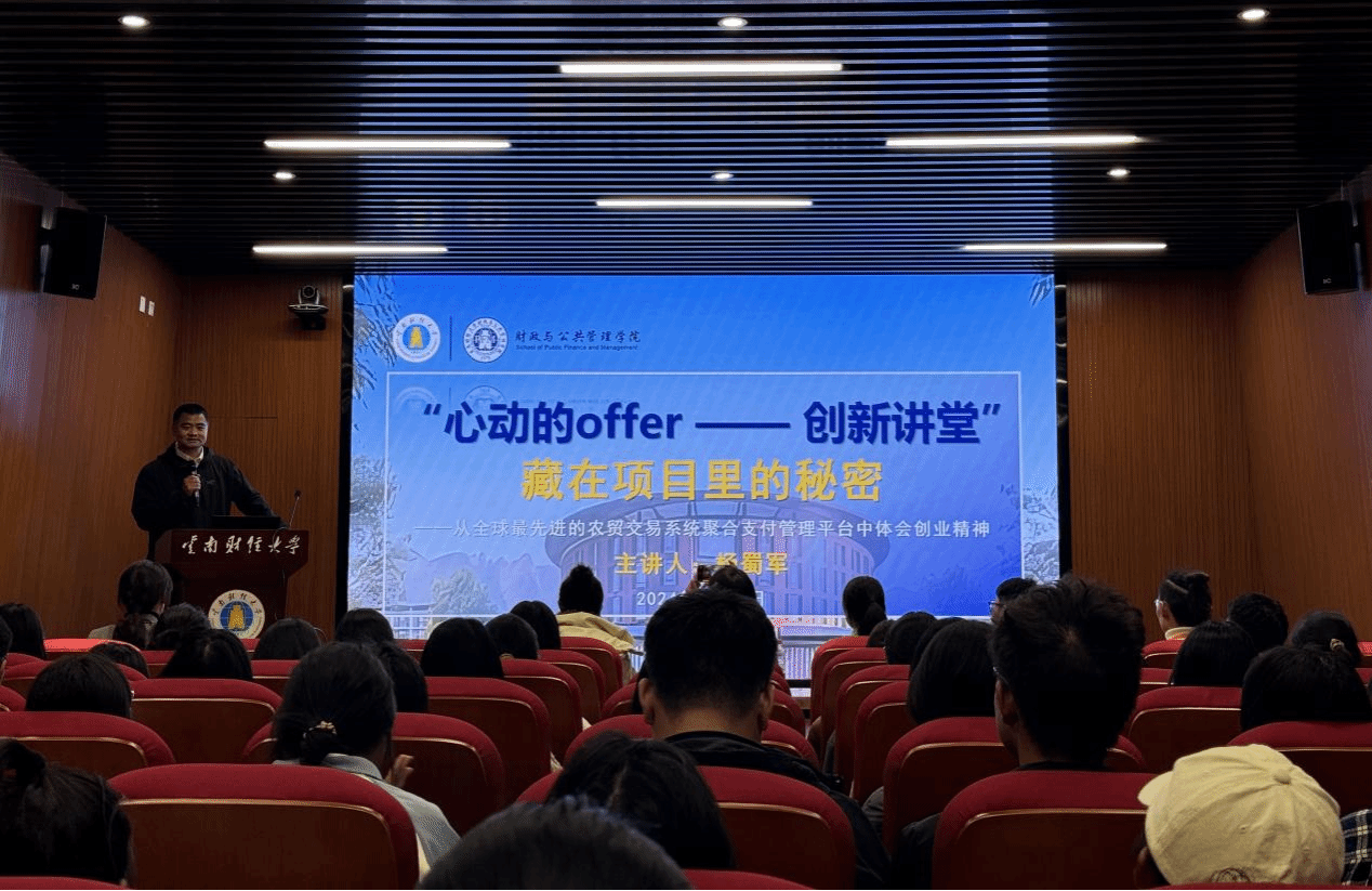 12月6日,财政与公共管理学院在安宁校区齐远楼106报告厅开展“心动的offer”——创新讲堂系列活动。朗坤控股集团CEO、william威廉中文官网客座教授杨蜀军,以“从全球最先进的农贸交易系统聚合支付管理平台体会创业精神”为题开展讲座。活动由学院党委副书记王晓芬主持。
