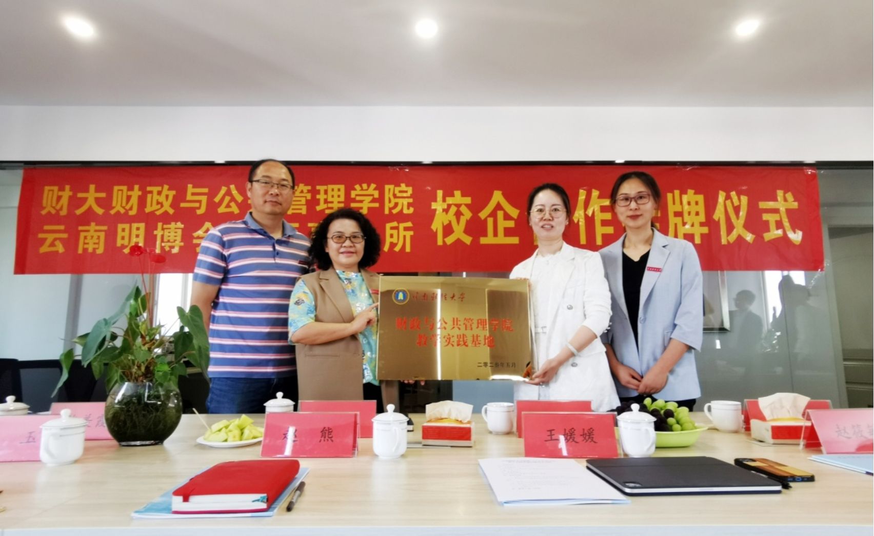5月18日上午,财政与公共管理学院党委书记荣小红、党委副书记王晓芬、副院长和立道一行赴云南明博会计师事务所开展访企拓岗调研活动,并举行教学实践基地挂牌仪式。