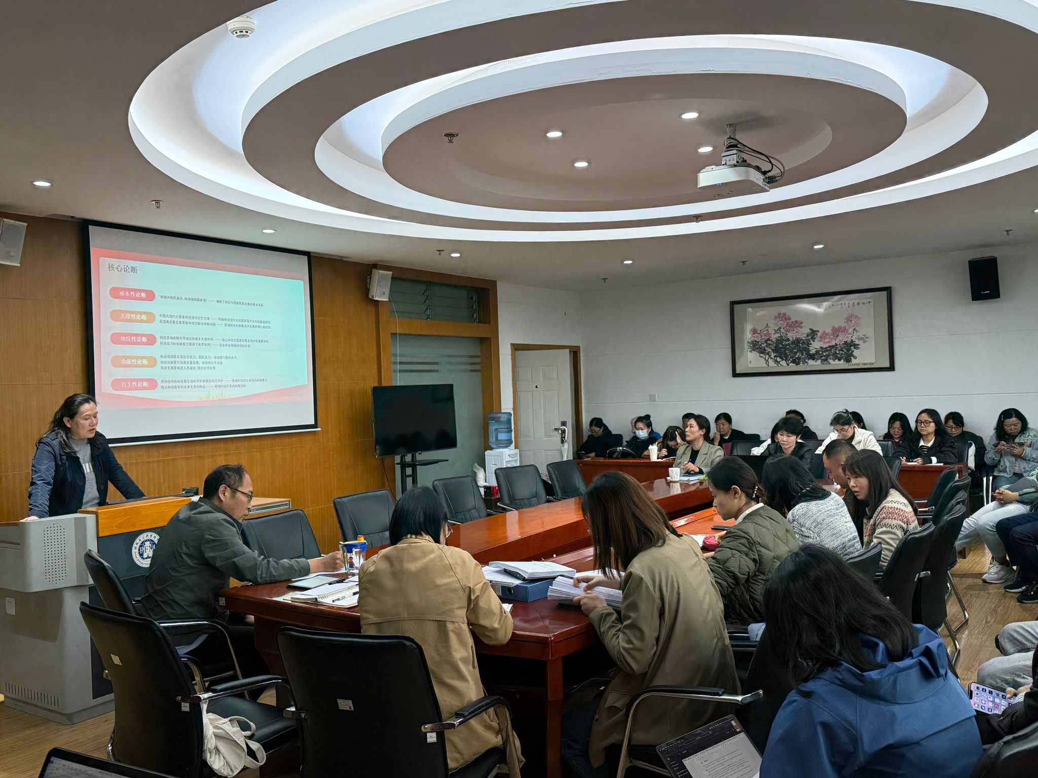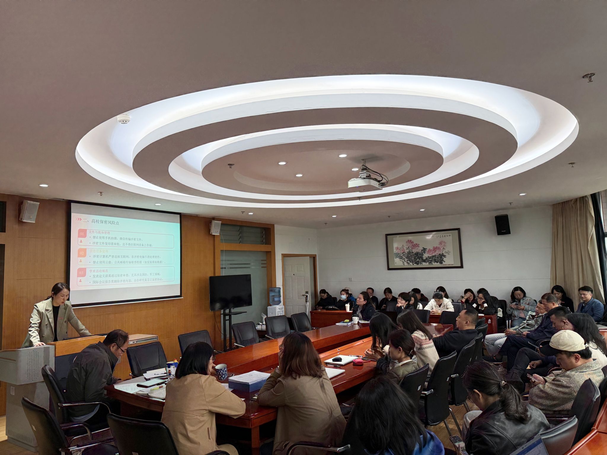 王晓芬以“增强保密意识 筑牢安全防线”为主题作专题领学。她对新修订《保密法》进行了系统阐述,详细解读了高校保密工作的重点和风险点,并结合典型案例开展了警示教育。王晓芬强调,要深入学习贯彻习近平总书记关于总体国家安全观的重要论述,充分认识保密工作的重要性,切实增强保密意识,严格遵守保密法律法规和学校保密工作制度,确保学院各项工作安全稳定开展。