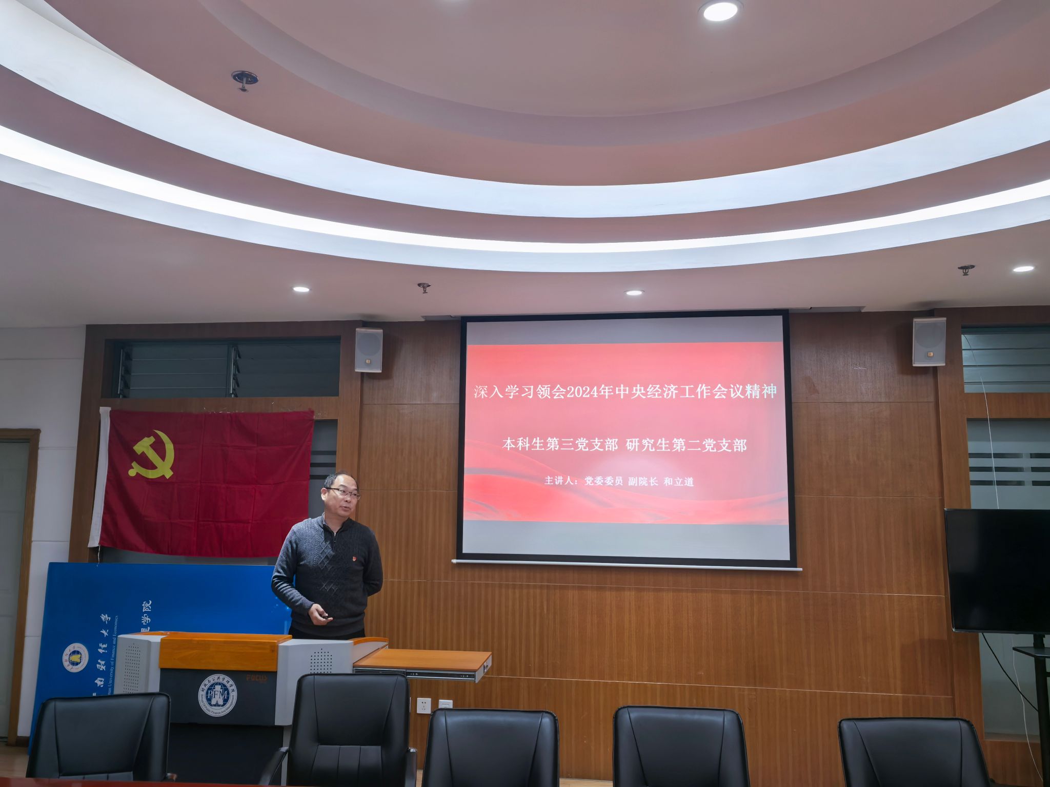 12月24日,财政与公共管理学院本科生第三党支部与研究生第二党支部于逸夫楼923开展“深入学习领会2024年中央经济工作会议精神”专题党课活动。本次党课由和立道副院长主讲,本科生第三党支部、研究生第二党支部全体同志参加学习。
