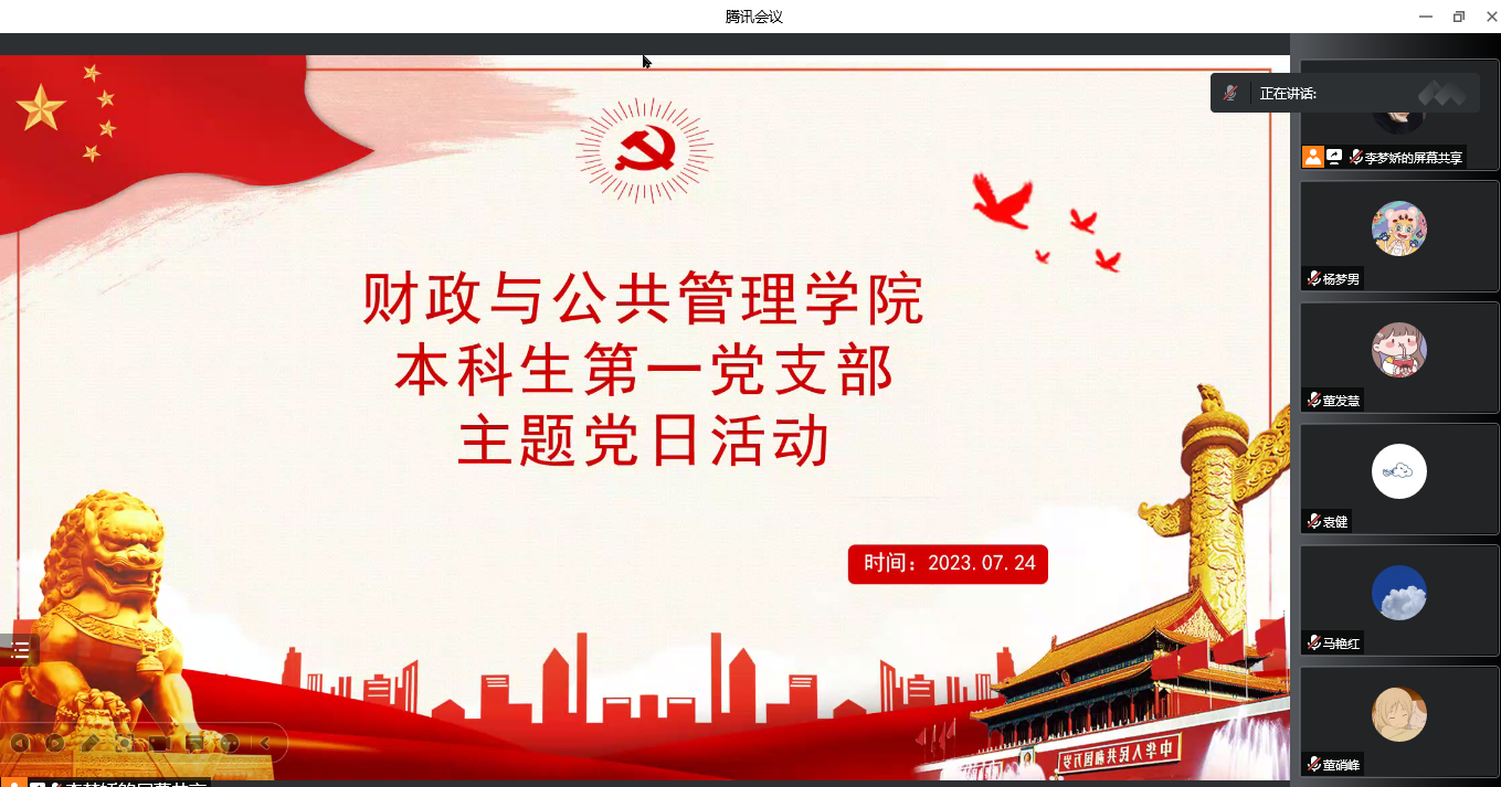 2023724日,财政与公共管理学院本科生第一党支部通过腾讯会议线上开展党风廉政建设主题党日活动。