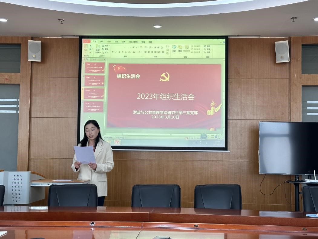 2023年3月10日下午,财政与公共管理学院研究生第三党支部召开2022年度组织生活会暨民主评议党员大会。会议由支部书记王淑一主持,邀请学院党委委员和立道到会指导,支部全体党员参加。