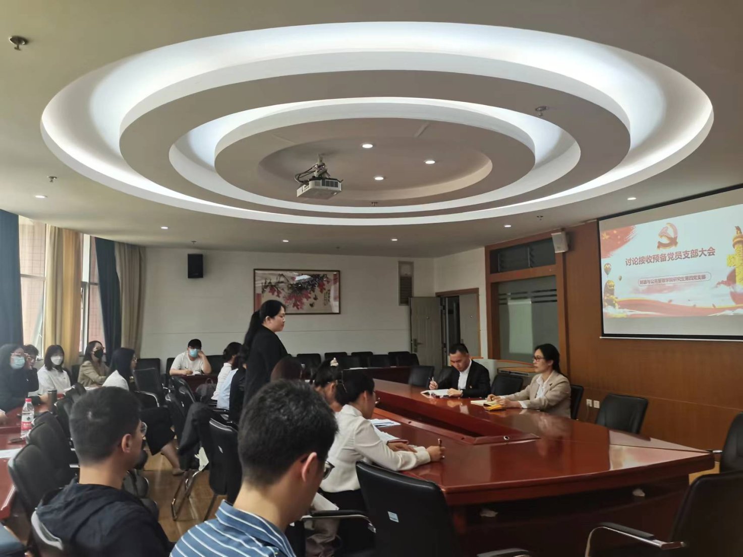 2022年5月11日下午五点,财政与公共管理学院研究生第四党支部在逸夫楼923教室召开接收预备党员支部大会。参加此次会议的有财政与公共管理学院党委副书记王晓芬老师与研究生第四党支部的全体党员同志,本次会议由支部书记李昊哲同志主持。