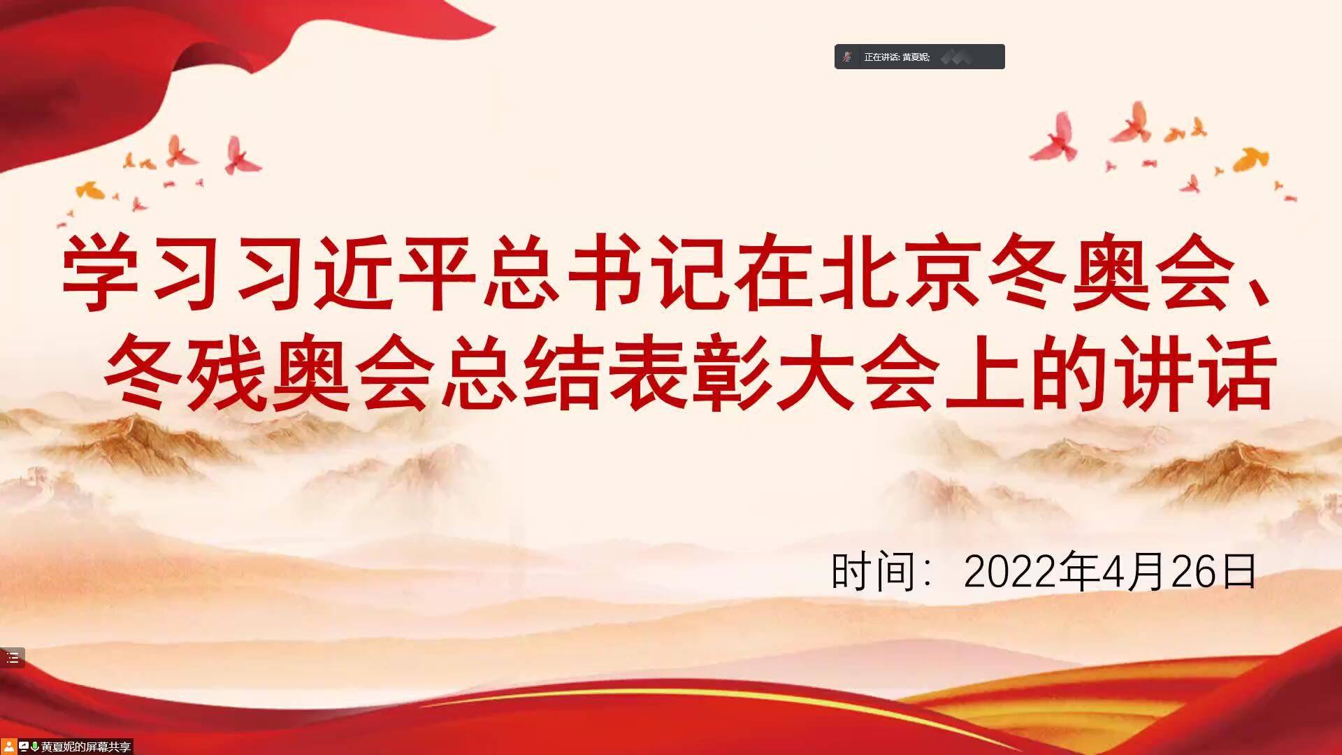 2022年4月26日下午2点,财政与公共管理学院本科生第四党支部通过腾讯会议召开四月份主题党日活动,支部全体党员学习了习近平总书记在北京冬奥会、残奥会总结表彰大会上的讲话精神。