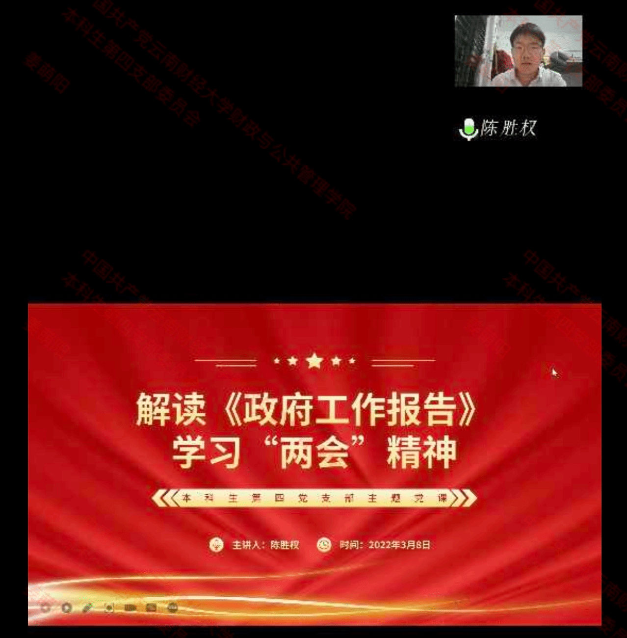 2022年3月8日晚上八点半,财政与公共管理学院本科生第四党支部组织学习两会重要内容。此次会议采取线上的方式进行,由党支部书记葛译遥老师主持,支部全体党员参与。