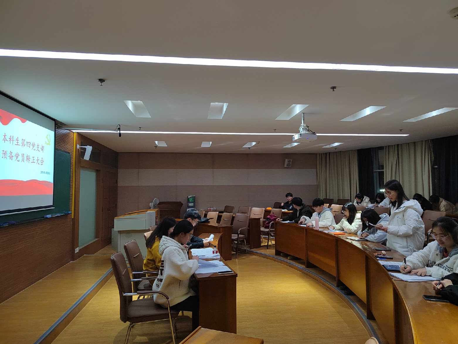2021年11月26日,财政与公共管理学院本科生第四党支部在逸夫楼706召开预备党员转正大会。本次预备党员转正大会由支部书记葛译遥老师主持,上级党委委员李永康老师出席会议,支部三名正式党员以及所有预备党员全部参会。