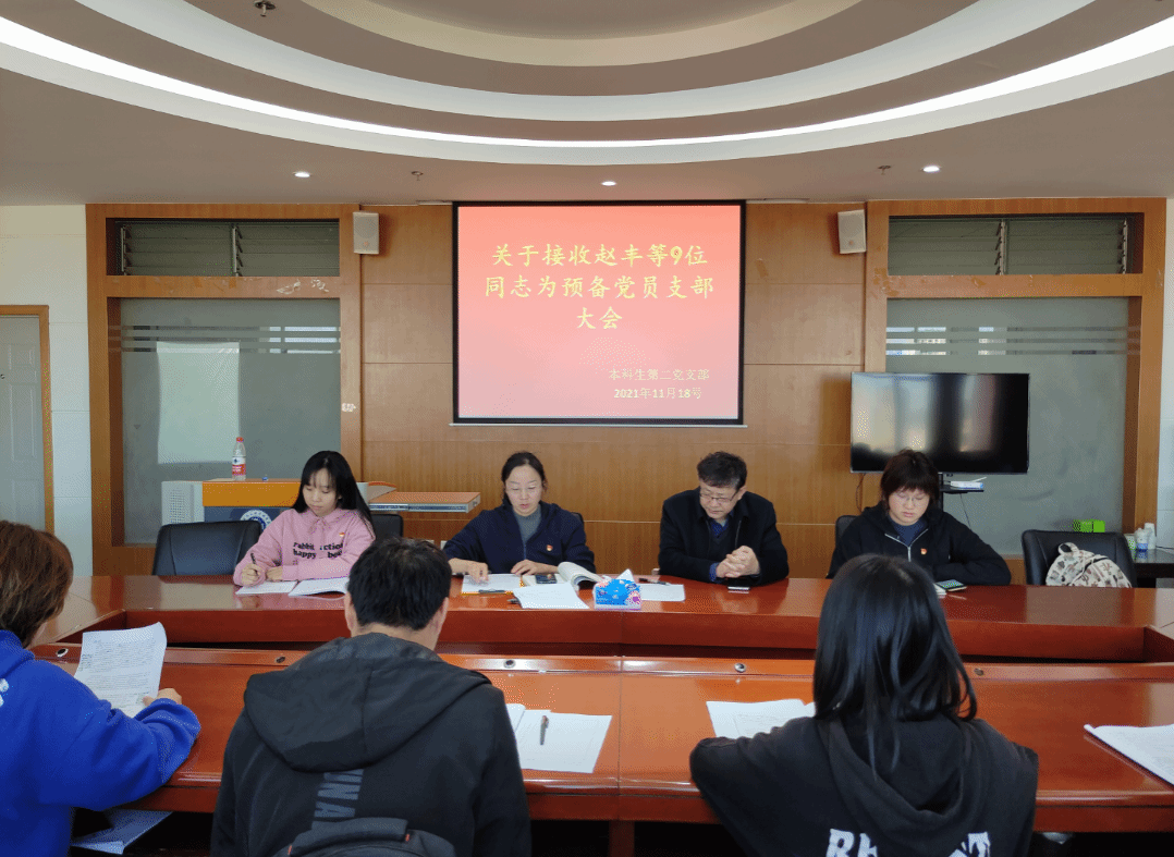 2021年1118日中午,财政与公共管理学院本科生第二党支部在逸夫楼923召开关于接收赵丰等9位同志为预备党员大会。本次大会由支部书记袁芳主持,上级党委委员韩全芳参会,支部正式党员,预备党员全部参会。