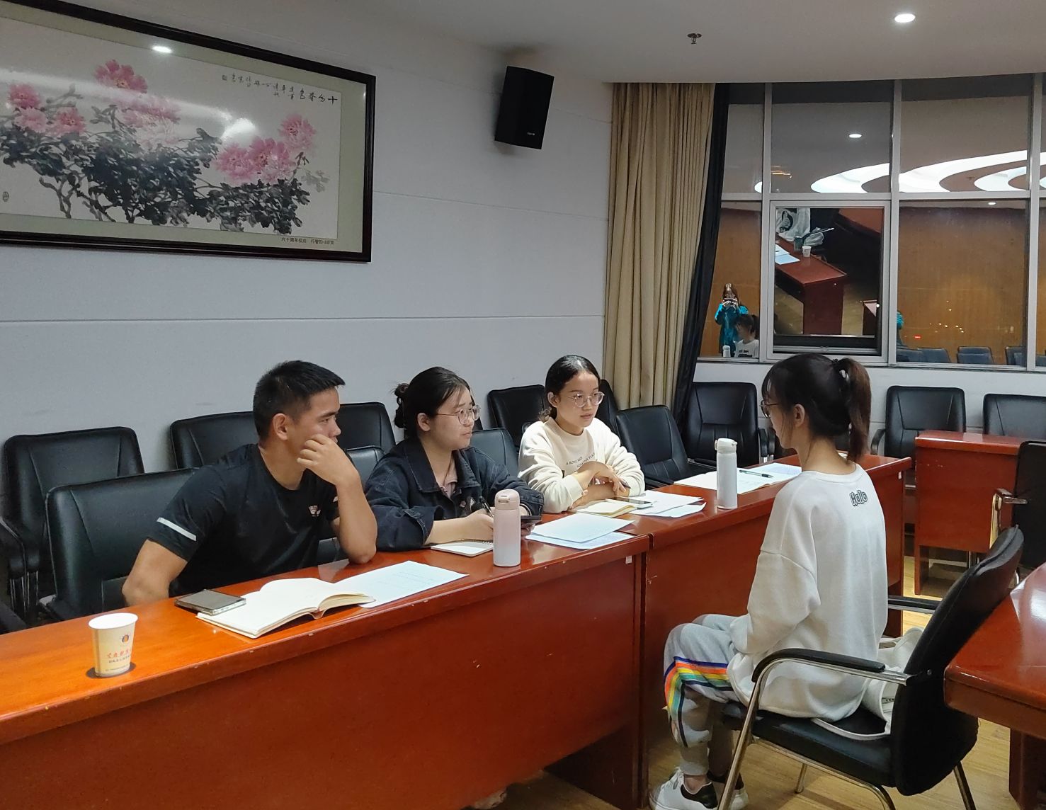 20211015日下午六点,财政与公共管理学院本科生第四党支部于逸夫楼923进行发展对象谈话,支部书记葛译遥与支部支委分为两组,围绕着思想变化、对党理论知识的了解、以及对于时事热点的看法与谈话对象进行谈话。