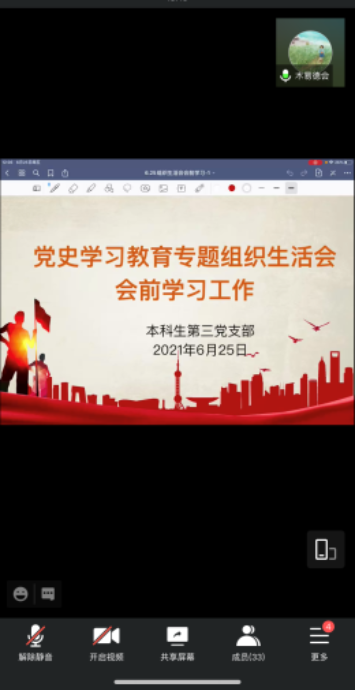 2021年6月25日中午,财政与公共管理学院本科生第三党支部在线上腾讯会议组织开展本月党史学习教育专题组织生活会会前学习工作,本次会议主讲人为支部书记杨德会同志,支部全体党员参加此次活动。