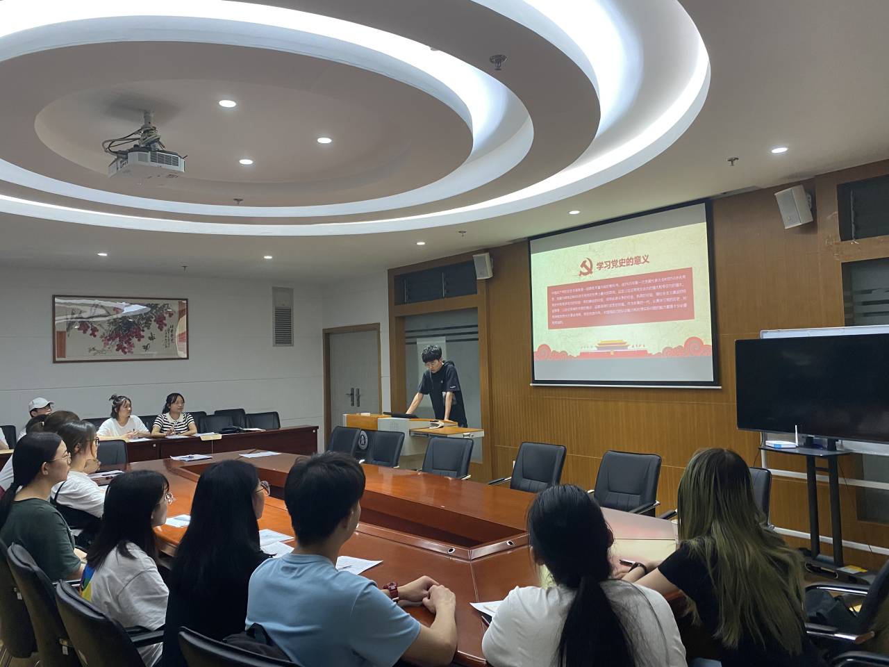 2021年5月12日星期三晚上7点,为提高同志们对于党史的理解和掌握,财政与公共管理学院本科生第四党支部召集全体党员、预备党员、发展对象在逸夫楼923举办了学习中国共产党简史的党课学习活动。本四支部书记葛译遥同志出席本次活动,支部副书记陈智威同志为大家讲解、梳理中国共产党简史内容。