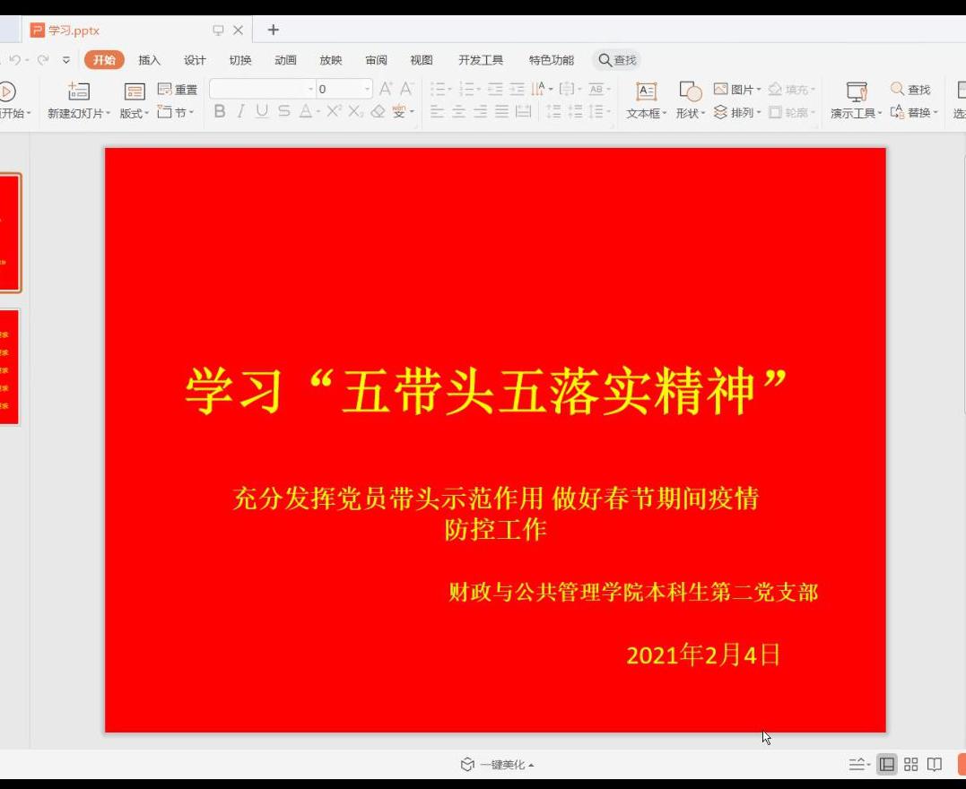 2021年2月4日,财政与公共管理学院本科生第二党支部,在线上开展了“关于春节后疫情防控五带头五落实精神学习心得交流”,支部全体成员参加交流分享会。