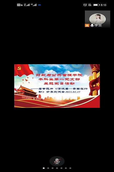 2021年2月25日,财政与公共管理学院本科生第一党支部通过腾讯会议平台在线上召开二月主题党日活动,活动主题是看专题片《清流毒——云南在行动》分享交流会,由支部书记李亚主持会议。