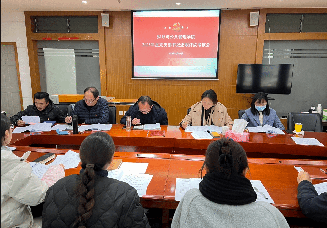 2024年125日下午,财政与公共管理学院在逸夫楼923召开2023年度基层党支部书记述职评议考核会会议传达学习了习近平总书记关于党的建设的重要思想,学院党委副书记王晓芬主持会议,学院党委委员、全体党支部书记参加了会议。