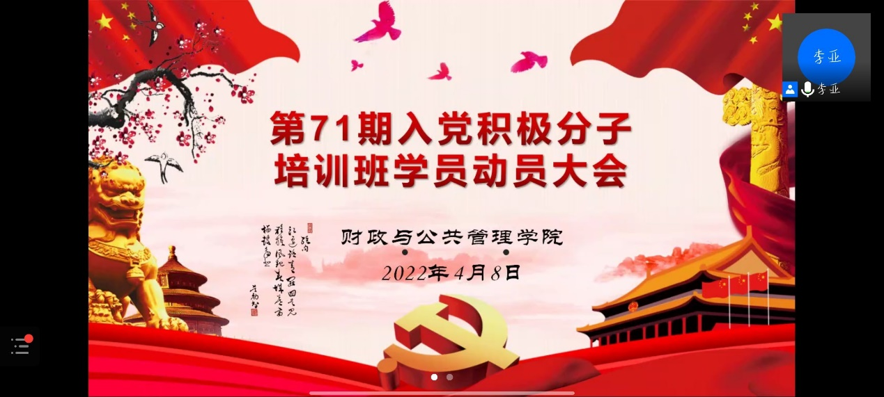 2022年4月8日19:30,财政与公共管理学院于腾讯会议线上开展第71期入党积极分子培训班学员动员大会。本次大会由学院组织员李亚老师主讲,财政与公共管理学院第71期共308名入党积极分子参加。