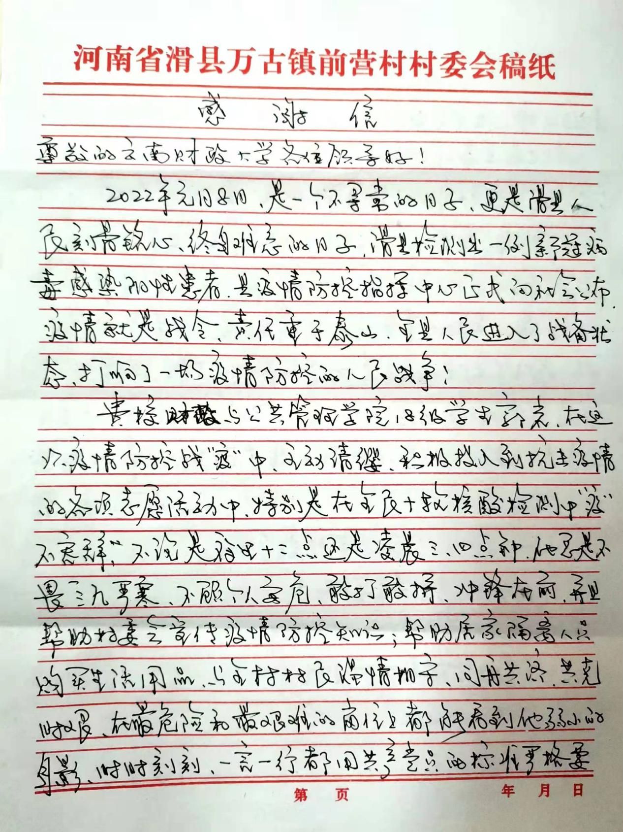 河南省滑县万古镇前营村村委会向财政与公共管理学院寄来感谢信