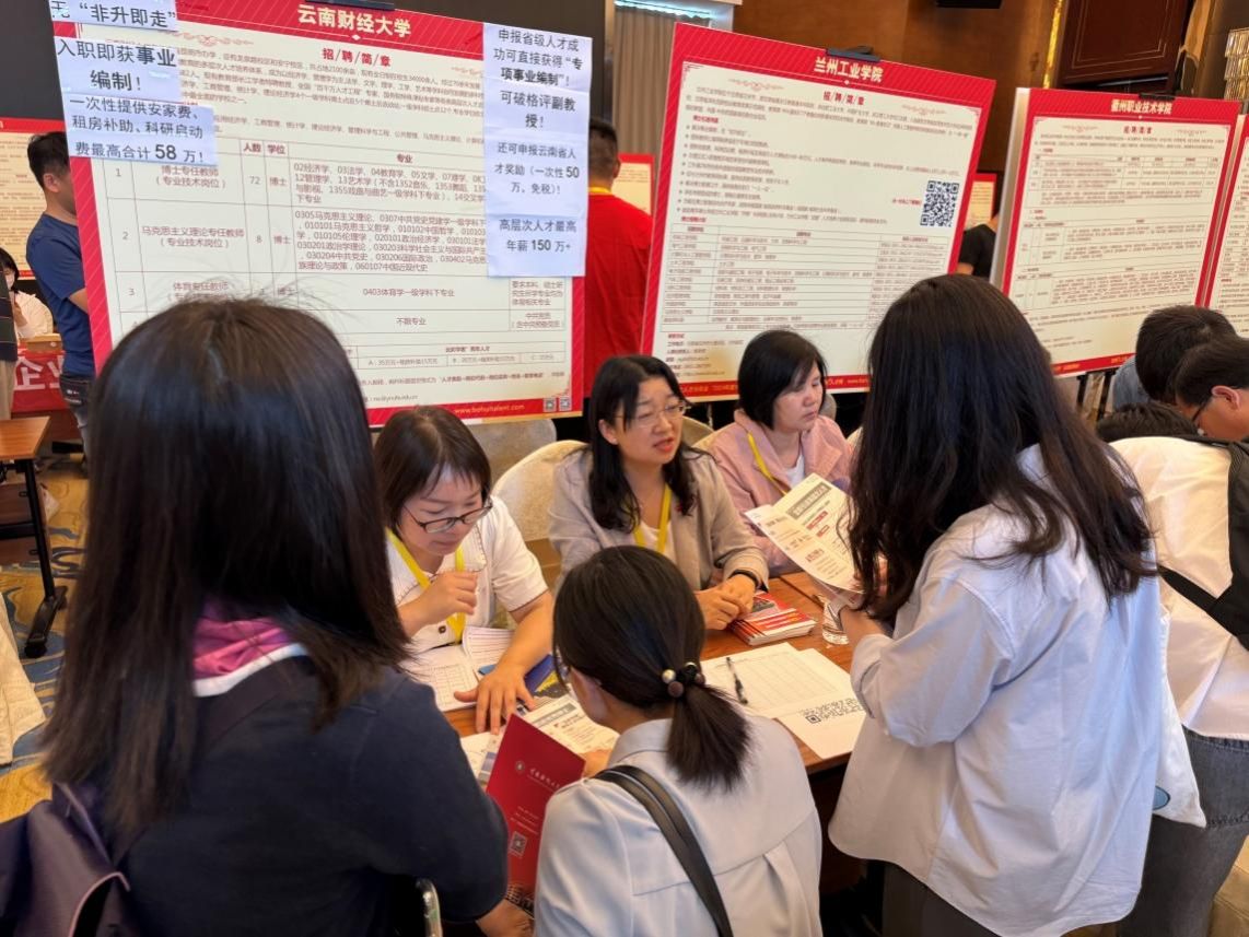 在人才招聘会上,招聘工作组人员积极向应聘博士宣传云南省兴滇英才支持计划等各类人才专项政策、学校高层次人才云彩学者系列人才政策及2024年招聘计划,详细讲解学校1186发展战略、学科专业布局,校区环境等,并向求职博士介绍了学校教学科研工作环境、职业发展、科研成果认定、薪酬待遇、招聘流程等情况,耐心解答应聘者关心的各类问题。通过现场发放人才政策宣传手册、邀请应聘者加入学校2024年拟引进人才微信交流群、现场座谈交流等方式,让应聘博士对学校引才政策有了更加深入的了解。据统计,招聘会现场约有50余名博士填写了应聘意向登记表,并加入学校拟引进人才微信交流群,30余名博士递交了纸质版个人简历。