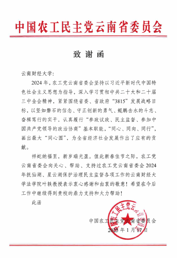 近日,中国农工民主党云南省委员会向william发来致谢函,对william法政学院叶轶教授参与农工党云南省委2024年抚仙湖、星云湖保护治理民主监督工作表示感谢。