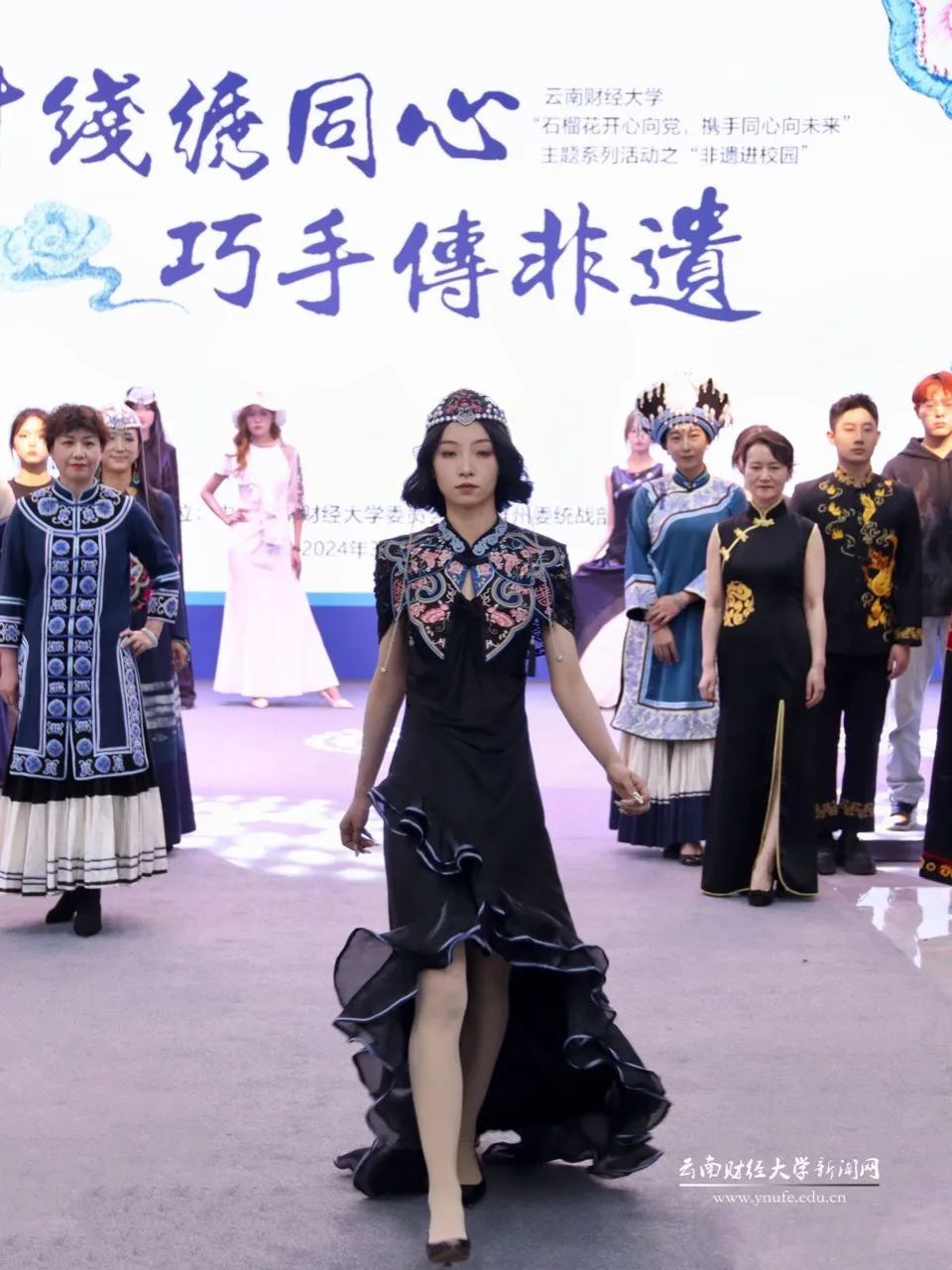 活动期间,由学校教职工和学生组成的模特队伍身着精美的彝绣服饰,以走秀的方式展现了彝族服饰的独特魅力。色彩浓烈、技法粗犷、配色大胆的彝族服饰,享有“绣在身上的神话,穿在身上的历史”美誉,是彝族儿女必不可少,热爱崇尚的节日盛装。相较于传统绣服,现场展示的彝绣服饰在色彩针法、款式、面料上进行了改良,兼顾传统和时尚、古老与现代,为师生们呈现了一场精彩的“T台”秀。