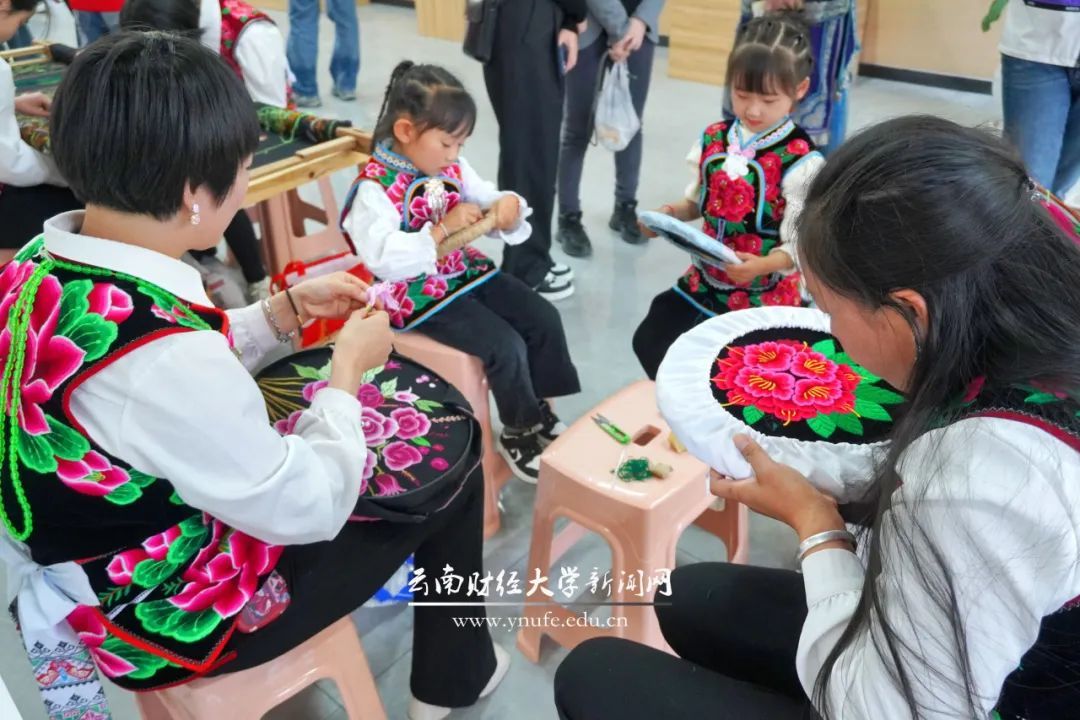在彝绣展览区,打籽绣刺绣工艺的青花瓷、螺旋绣刺绣工艺吉祥如意等一幅幅精美的彝绣展品吸引了不少师生驻足观赏。在绣娘们的指导下,部分师生还现场学习了刺绣的基本技巧和步骤。