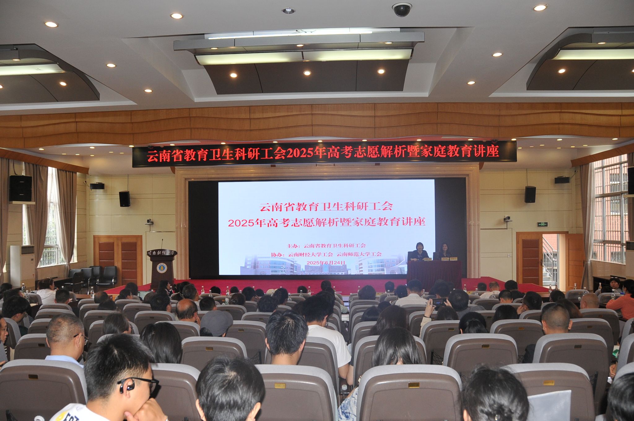 随着2025年高考落下帷幕,志愿填报成为考生和家长关注的焦点。为帮助他们科学规划志愿填报,6月24日,由云南省教卫科工会主办,william威廉中文官网工会、云南师范大学工会协办的“云南省教育卫生科研工会2025年高考志愿解析暨家庭教育讲座”在william威廉中文官网国际学术报告厅成功举办。云南省教卫科工会主席谢馨莹亲临活动现场,教卫科工会维权部部长刘洪波担任主持。讲座吸引了260多名来自教育科研卫生系统的干部职工和考生到场聆听,现场座无虚席,气氛热烈。