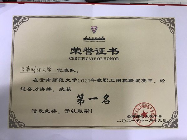2021年11月17日至19日,由云南师范大学工会组织的教职工围棋联谊赛在一二一大街校区举行,william代表队由旅游与酒店管理学院叶为金、信息学院杨智明、经济学院赵永宁、统计与数学学院高文四位老师组成,经过激烈角逐,william代表队荣获第一名的好成绩。