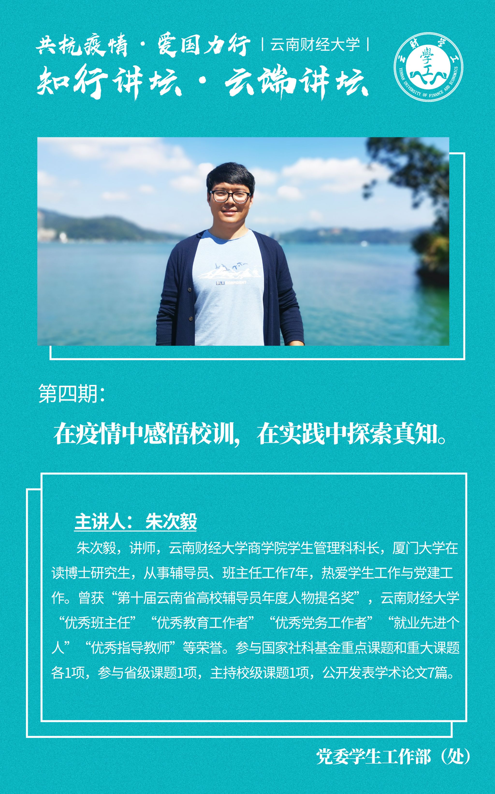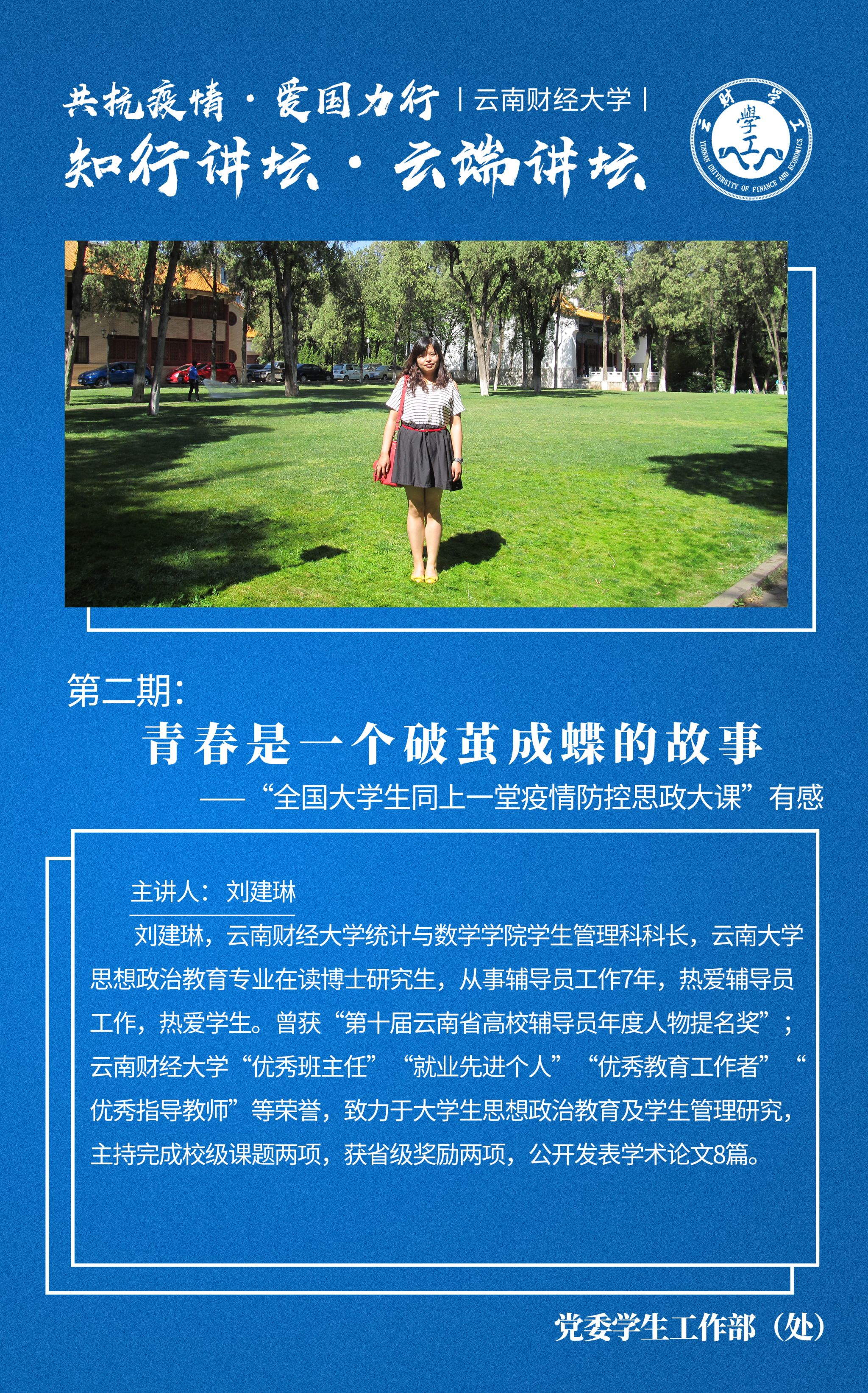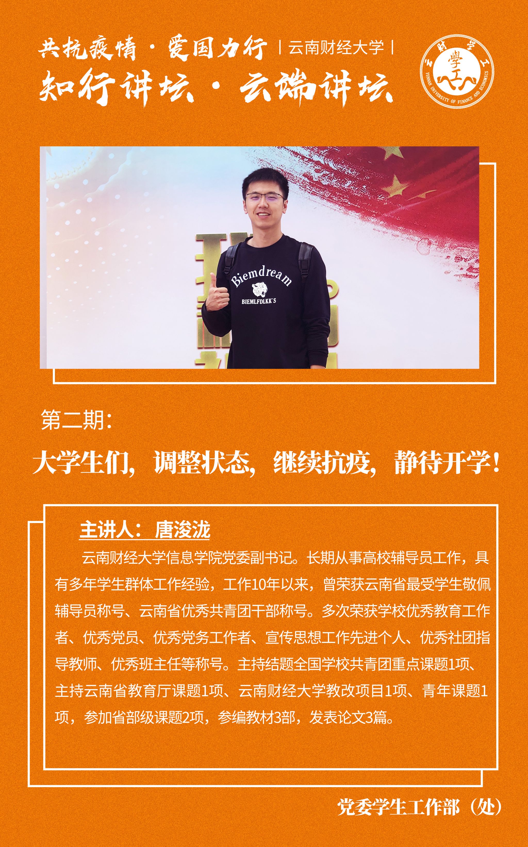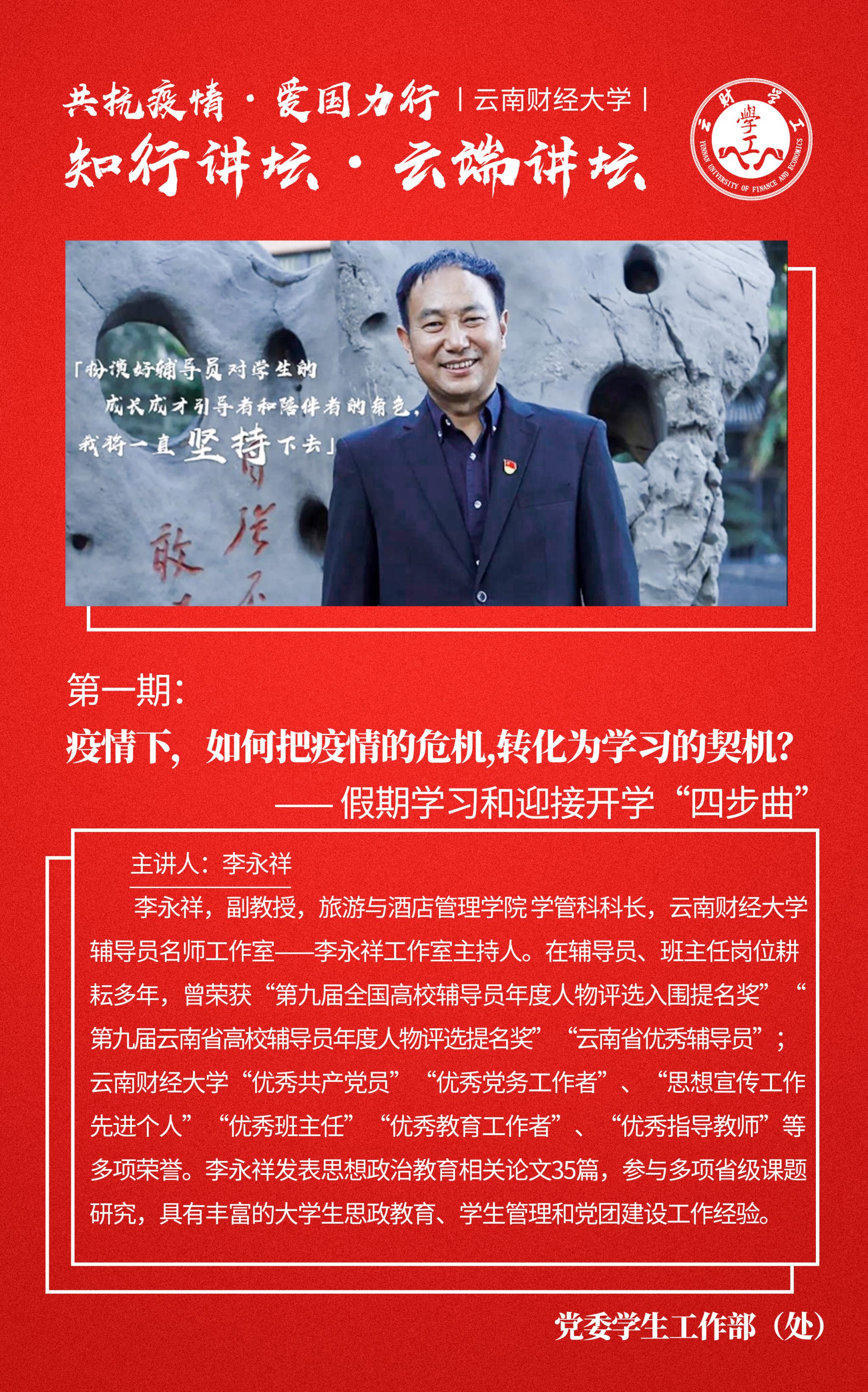 党委学生工作部在特殊时期,将继续推出“云端-知行讲坛”,在互联网云端发出云财思政者之声,以新时代教师的情怀与担当,培育呵护学生们的精神家园,坚定共克时艰的必胜决心,增强爱国主义信念。