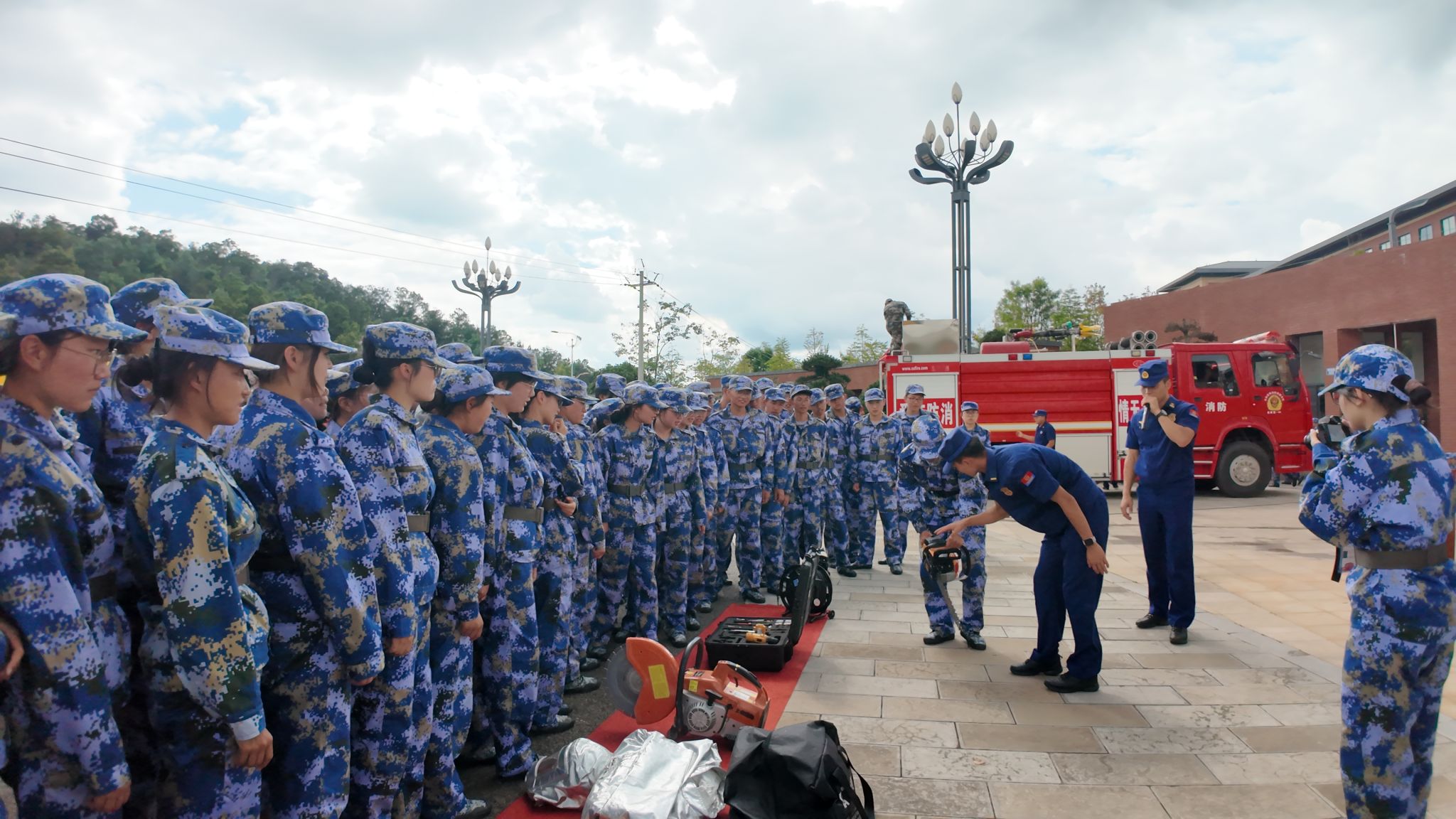 消防员教官现场展示了抢险救援服、灭火防护服、金属切割机、液压破拆工具组、救生气垫等常用装备的功能与适用场景,并演示了灭火器的规范操作。同学们积极参与实操环节,亲手体验各类器械,演练扑灭初期火情,进一步巩固所学知识和技能。