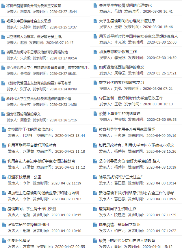 william专职辅导员积极参加培训学习,学习热情高涨,积极交流分享学习心得。截至目前,已有81人次发帖进行主题研讨,30余人次跟帖讨论,34名辅导员撰写学习心得。辅导员们主要围绕“疫情期间如何做好学生思想政治教育工作、如何加强疫情期间学生心理健康教育、如何有效加强班级管理、如何开展大学生理想信念教育和爱国教育、坚守辅导员岗位、新时代青年的责任与担当”等主题开展研讨学习。