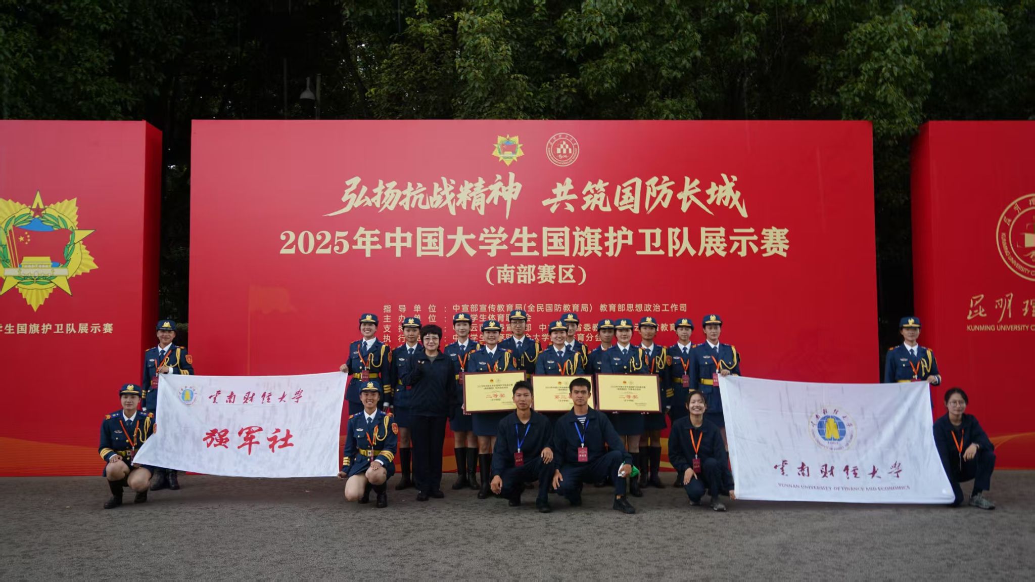 9月18日至22日,中国大学生国旗护卫队展示赛(南部赛区)在昆明理工大学隆重举行。学校强军社国旗护卫队18名女生参赛,凭借过硬的专业素养与顽强的拼搏精神,最终斩获升旗展示项目二等奖、队列动作项目二等奖,并夺得女子甲组第三名的优异成绩。