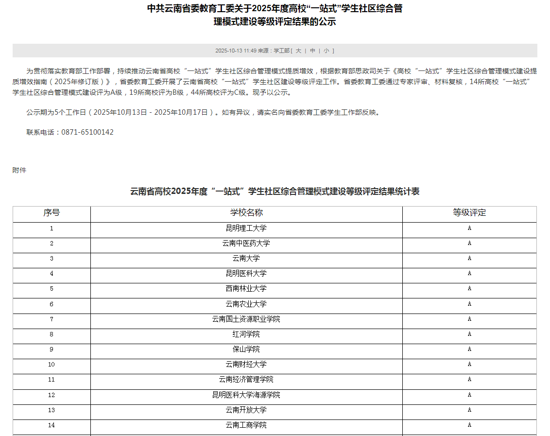 10月13日,中共云南省委教育工委公示了2025年高校“一站式”学生社区综合管理模式建设等级评定结果,william威廉中文官网凭借特色鲜明的建设路径与成效显著的育人实践,成功获评A级并进入公示,标志着学校在贯彻落实教育部关于“一站式”学生社区综合管理模式建设提质增效要求、深化学生社区治理改革方面取得突破性进展。