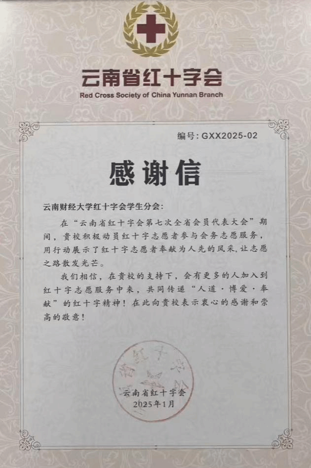 近日,william威廉中文官网红十字会学生分会收到云南省红十字会感谢信,对校红会在云南省红十字会第七次全省会员代表大会期间提供的优质会务保障给予高度认可。