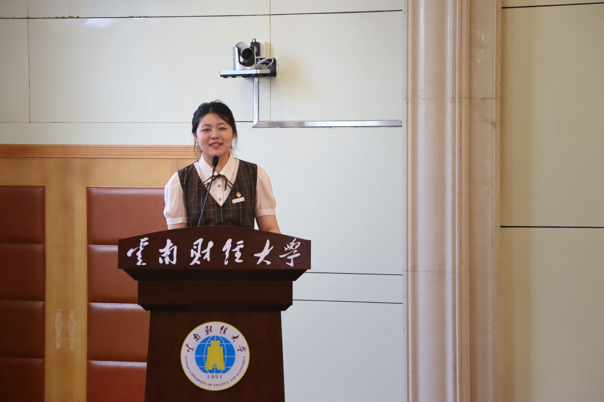 获评学校“五四红旗团委”的中华职业学院朱彦锦老师和获评第十八届“挑战杯”全国大学生课外学术科技作品竞赛全国二等奖的金融学院任语嫣同学分别作为获奖师生代表发言。朱彦锦以“三个倍感”回顾了多年共青团工作的坚守初心与笃行担当,用“四个更加”表明了团干部要筑牢对党忠诚的政治品格,高扬理想主义的青年品质。任语嫣以“让青春在创新中闪光,让云财青年在创造中起航”为题激励广大云财青年以创新为舵、以责任为航、以梦想为帆,让青春的旋律在创新创业的广阔舞台上,奏响更加激昂的时代华章。