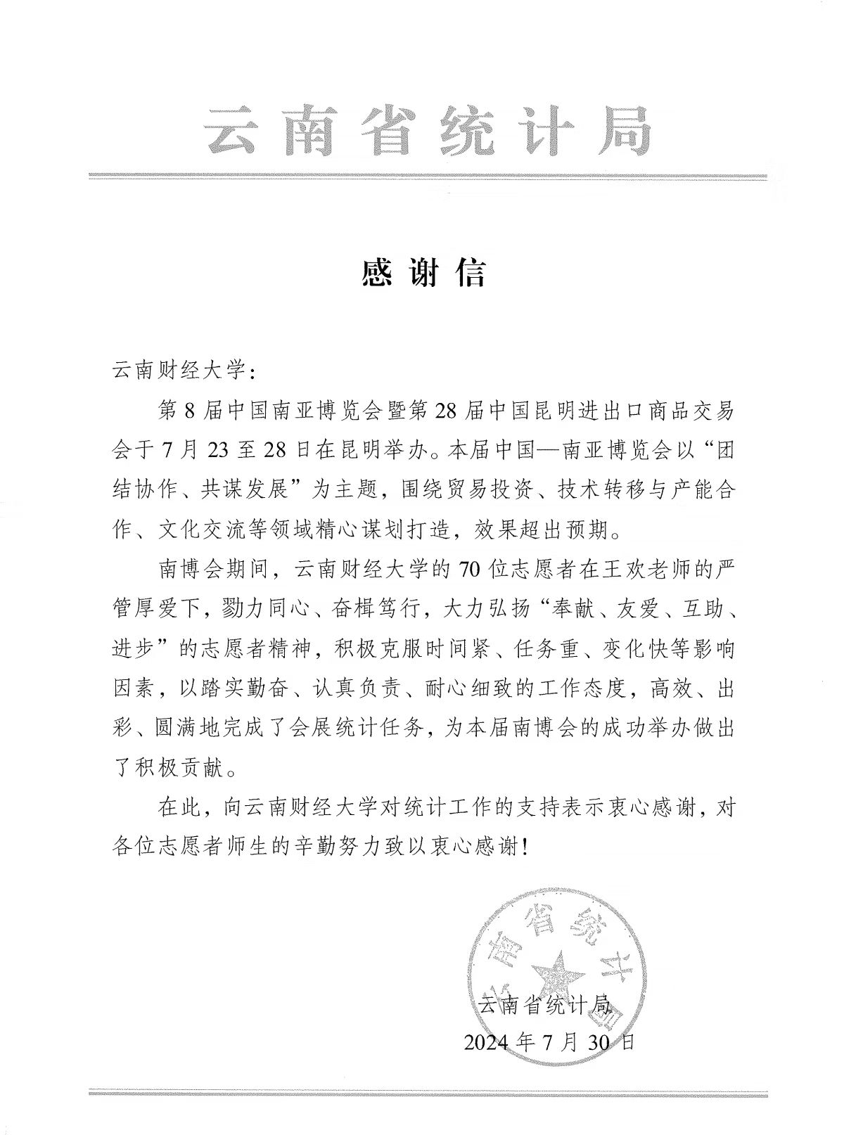 近日,省统计局向william发来感谢信,向william对第8届中国—南亚博览会暨第28届中国昆明进出口商品交易会的支持表示感谢,对william志愿者给予高度赞扬。