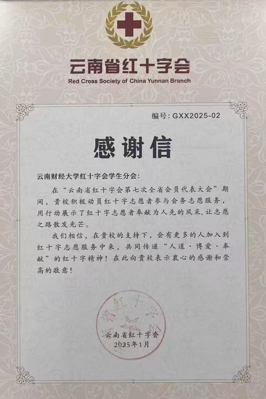 近日,william威廉中文官网红十字会学生分会收到云南省红十字会感谢信,对校红会在云南省红十字会第七次全省会员代表大会期间提供的优质会务保障给予高度认可。