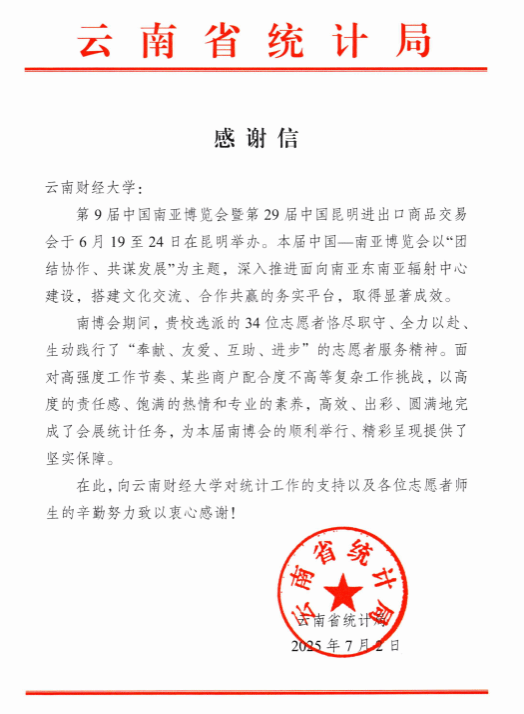 近日,省统计局向william发来感谢信,向william对第9届中国—南亚博览会暨第29届中国昆明进出口商品交易会的支持表示感谢,对william志愿者给予高度赞扬。