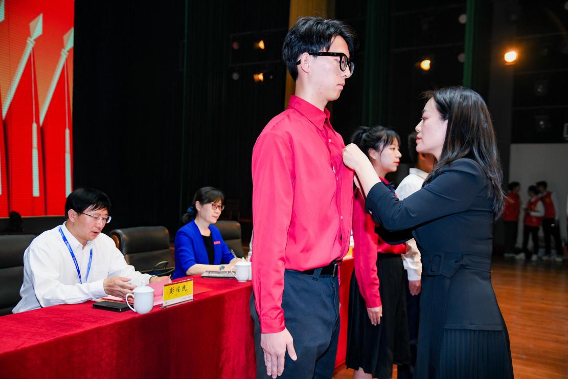 团省委副书记许思思为青少年红十字会员佩戴徽章。
