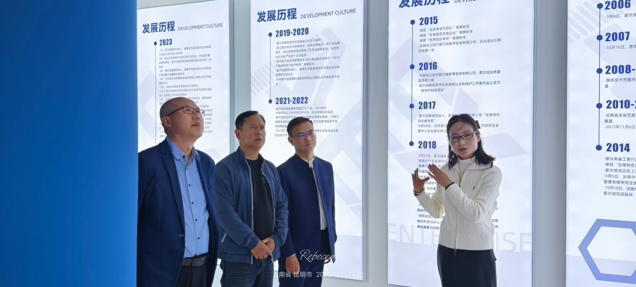 11月11日下午,社会合作办公室(校友工作办公室)一行走访校友企业爱尔信集团有限公司。公司创始人、董事长,云南省第十四届人大代表,昆明市第十四届政协委员,2001级校友毛良带领参观集团总部及爱尔信数字经济产业学院。