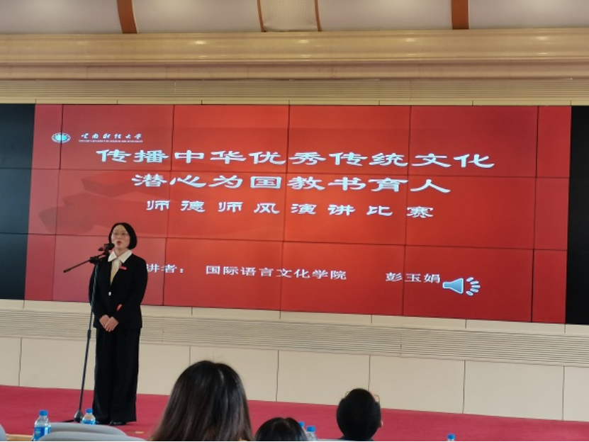 在本次比赛的备战过程中,彭老师克服各种实际困难,利用有限的时间,认真的、逐字逐句的斟酌演讲稿,录制预赛视屏,制作演讲背景PPT,一遍又一遍地模拟演讲、对稿、对PPT,最终为师生们呈现了一个富有文化内涵、精彩、完美的演讲,较好地向广大师生展示了国际语言文化学院教师“传播中华优秀传统文化,潜心为国教书育人”的精神和事迹。让我们向彭老师学习,“言传身教,春风化雨”!